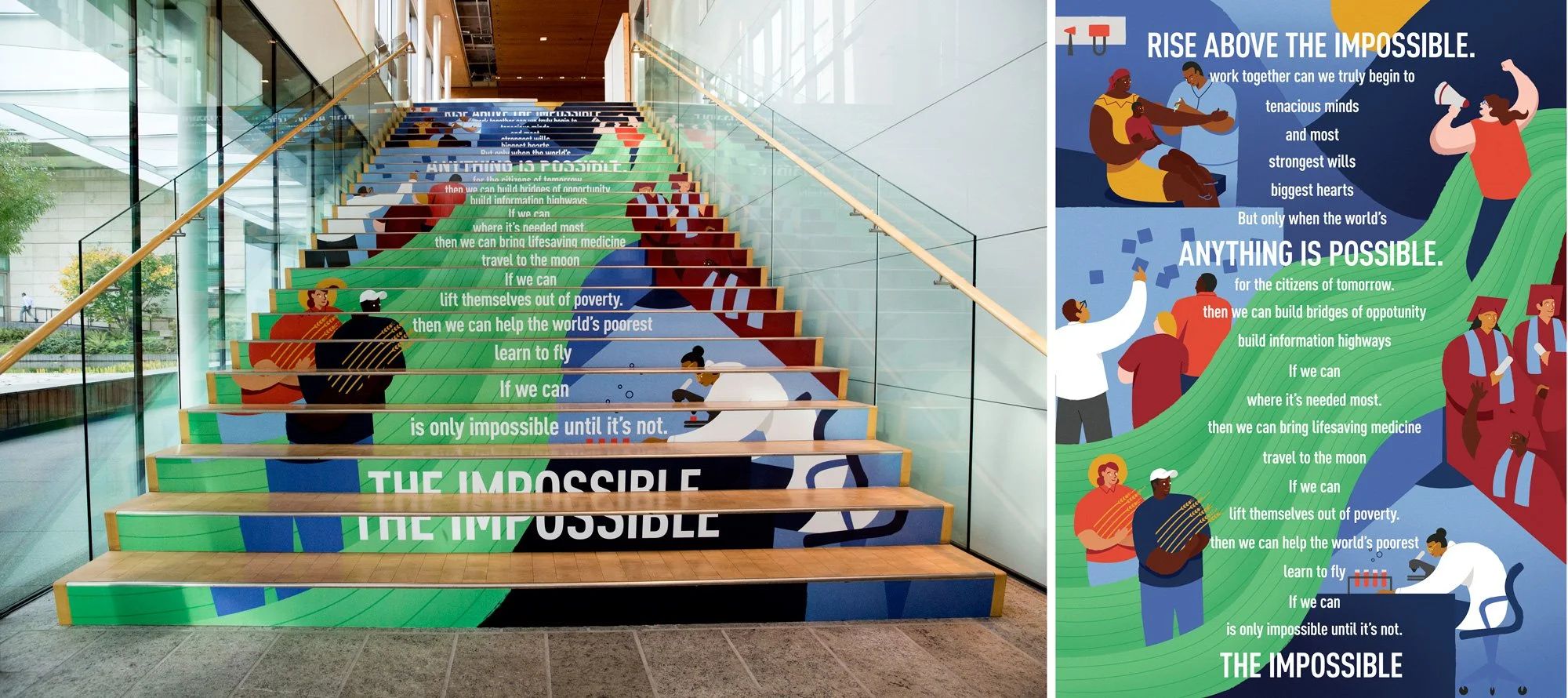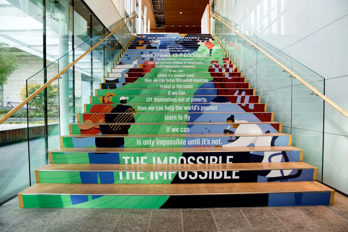 As a powerful reminder of the foundation’s journey and its future aspirations, we design a mural on the main central stairway in the Gates Foundation in Seattle. The bold message, "If we can... Anything is possible," reflects the spirit of overcoming challenges and driving global change. It inspires all who pass by to stay focused on the foundation’s mission of tackling poverty, improving health, and expanding opportunity. The mural reinforces that no goal is too big when united by a shared purpose.