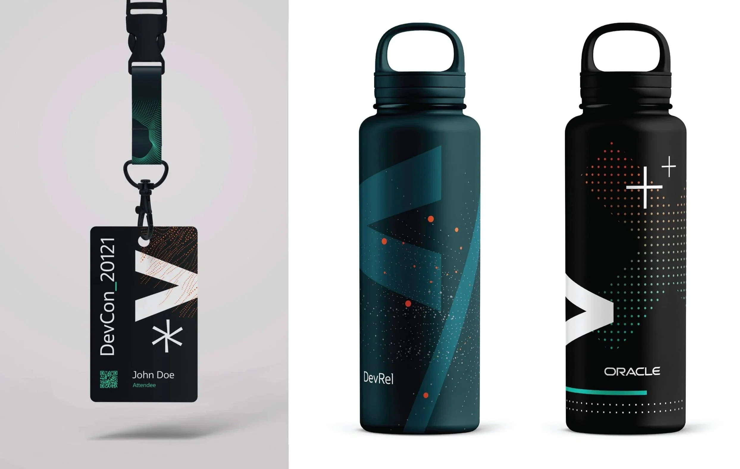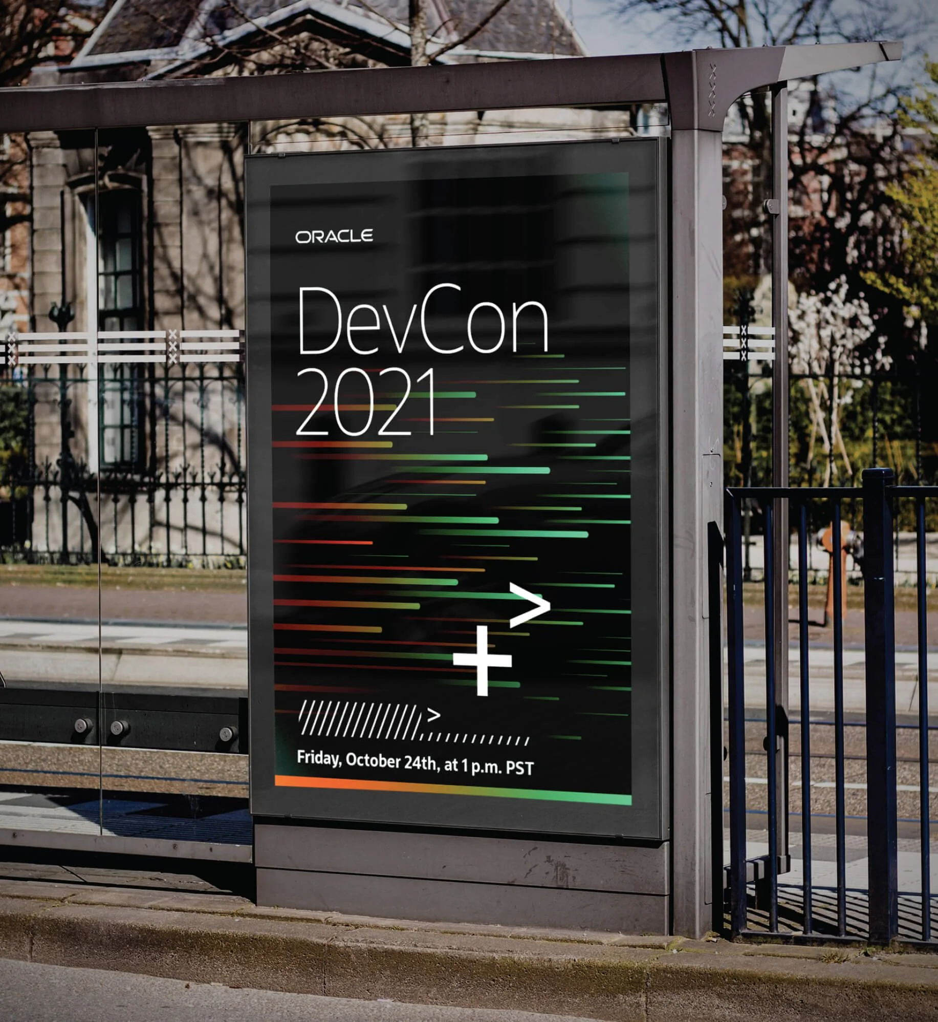 The DevRel identity extended into Oracle DevCon as a bold, immersive event system. Core coding symbols became graphic anchors, while data-inspired textures evolved into dynamic streaks that conveyed speed, collaboration, and innovation. What began as a brand language scaled seamlessly across posters, social, and environmental design.